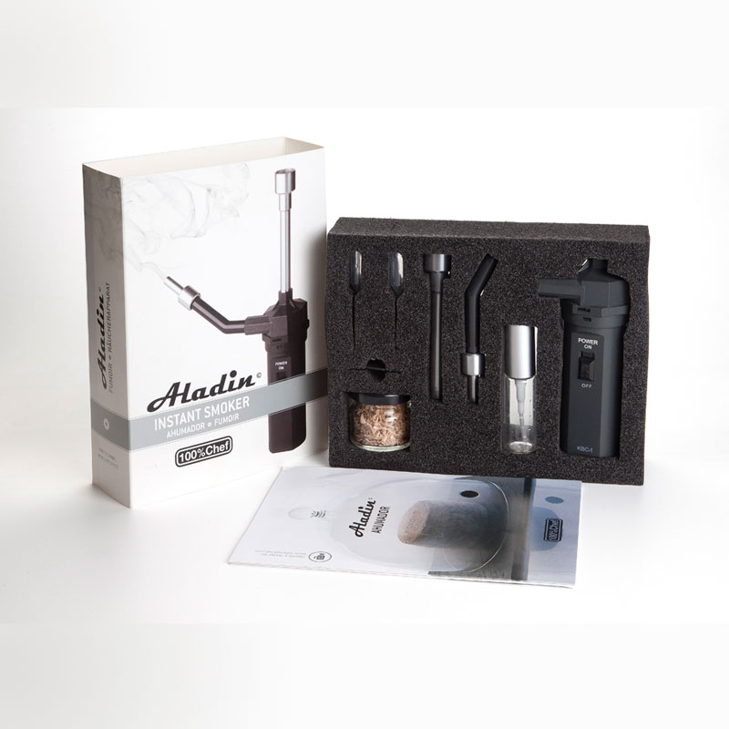 Aladín es una de las herramientas más vendidas desde su aparición en nuestro catálogo. El Nuevo Kit de ahumado instantáneo Aladín permite introducir el humo en envases cerrados con la finalidad de ahumar al momento pequeños espacios, o alimentos en poco tiempo, personalizando con los aromas escogidos cualquier alimento. Ahora presentamos un nuevo modelo semi profesional que aporta una conexión directa a nuestras campanas de ahumado además ahora el tubo roscado elimina el antiguo método de fijación de la cazoleta a la base del aspirador, su grosor y tamaño impide el recalentamiento de la parte mecánica, dando una mayor fiabilidad y resistencia. El aparato dispone de instrucciones y consejos, un bote hermético de serrín, un spray vaporizador, pipetas y un kit de rejillas.