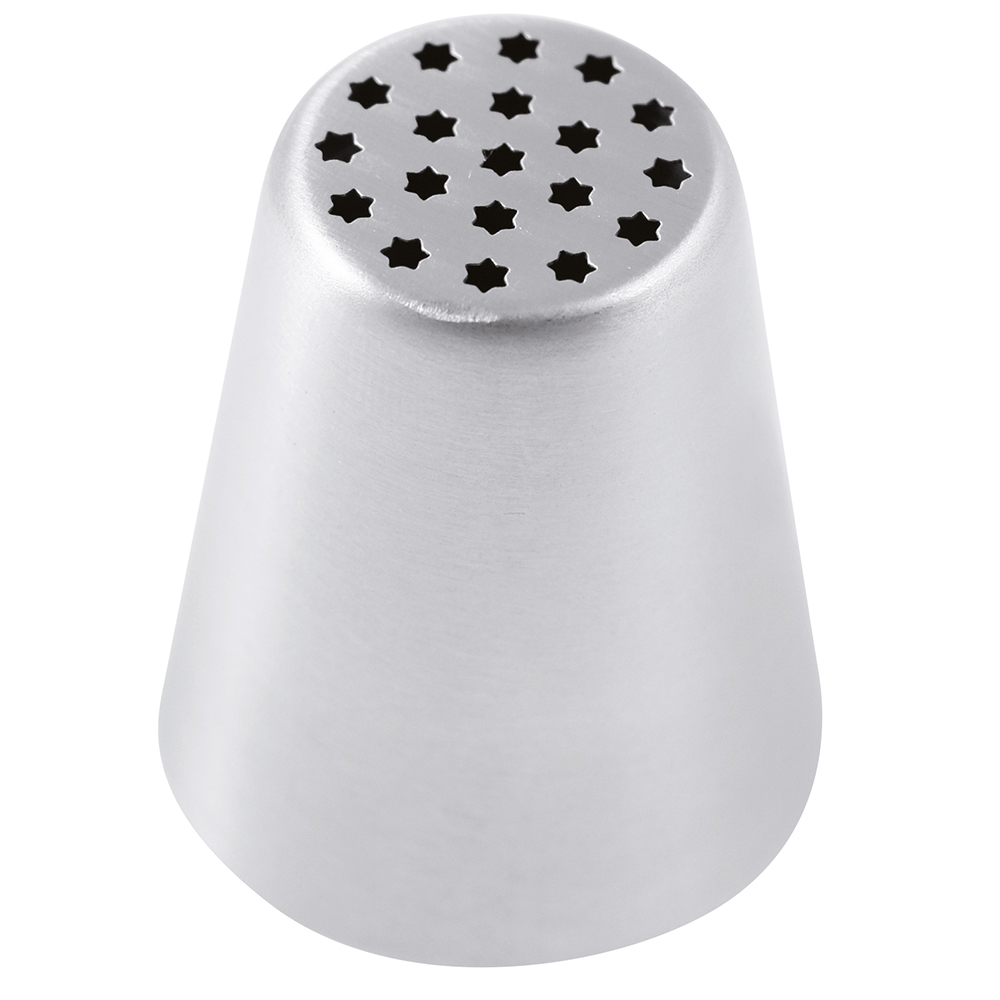 Boquilla de acero inoxidable para sac à poche o manga pastelera con forma particular. Esta boquilla no presenta ninguna soldadura, garantizando una salida uniforme del producto y una alta resistencia.