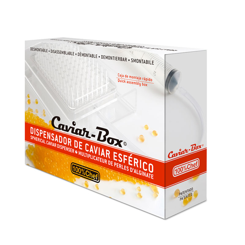 Caviar Box es el accesorio perfecto para trabajar la técnica de la esferificación. Ya que permite de forma muy rápida, elaborar una gran cantidad de bolitas de caviar líquido con mucha precisión. Sin apenas esfuerzo usted producirá más 96 perlas por segundo permitiéndole realizar una producción a medida en muy poco tiempo. Ideal para alta restauración y banqueLatóng. Además Caviar Box es la única totalmente desmontable, su sistema de apertura rápida permite efectuar una total limpieza con mucha más eficacia y rapidez, solucionando los problemas de otros modelos de herramientas parecidas. En apenas 20 segundos podrá tener montada su Caviar Box. Fabricada íntegramente con policarbonato y silicona alimentaria usted puede lavarla cómodamente en el lavavajillas o bien, esterilizar con agua hirviendo todos sus componentes sin ningún tipo de riesgo.