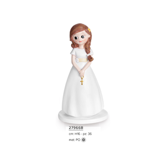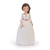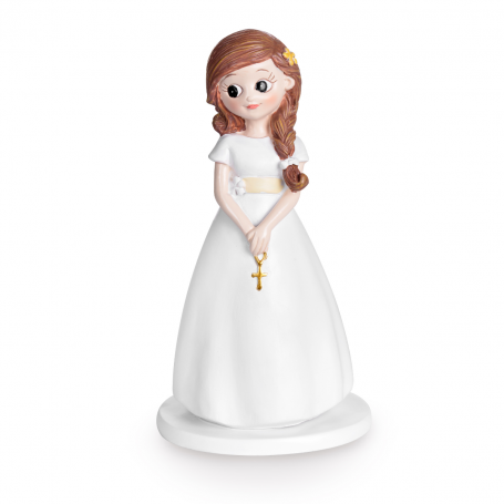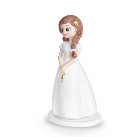 Con esta figura de niña con Rosario en la mano y flor en el pelo podrás decorar tu tarta de Comunión dándole un toque dulce y elegante.