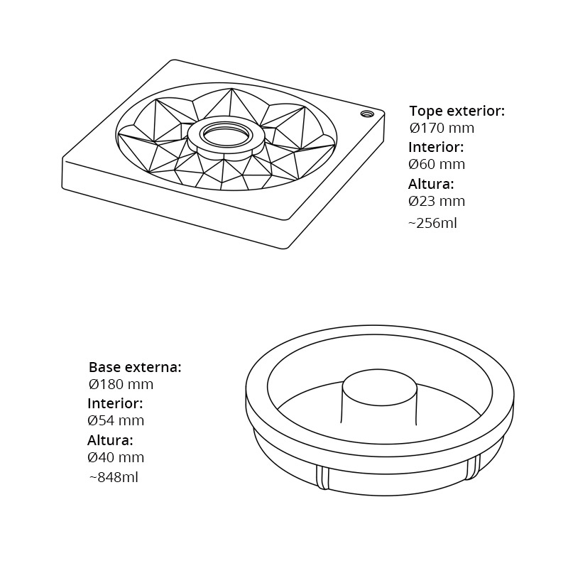 Dimension 2ª molde: Ø mm 180 / Ø mm 54 x 40mm h 848 ml