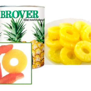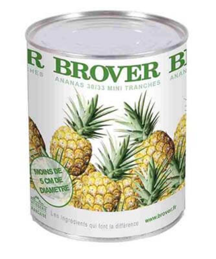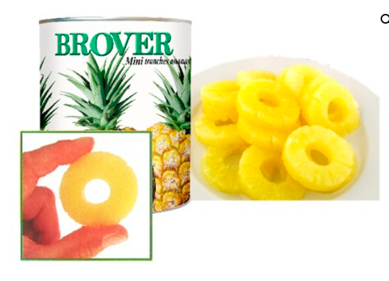 Rigurosamente seleccionadas, las rodajas de piña BROVER están perfectamente calibradas según el formato de la caja: 10 rodajas 3/4, 12 rodajas 4/4 y 66 rodajas 3/1. Las piñas BROVER también están disponibles en mini rodajas de la variedad Victoria, muy fragantes y con etiqueta “clean label” (sin aditivos, sin colorantes, sin conservantes). Nuestra compota de piña en cubos y trozos también cuenta con la certificación de «etiqueta limpia».