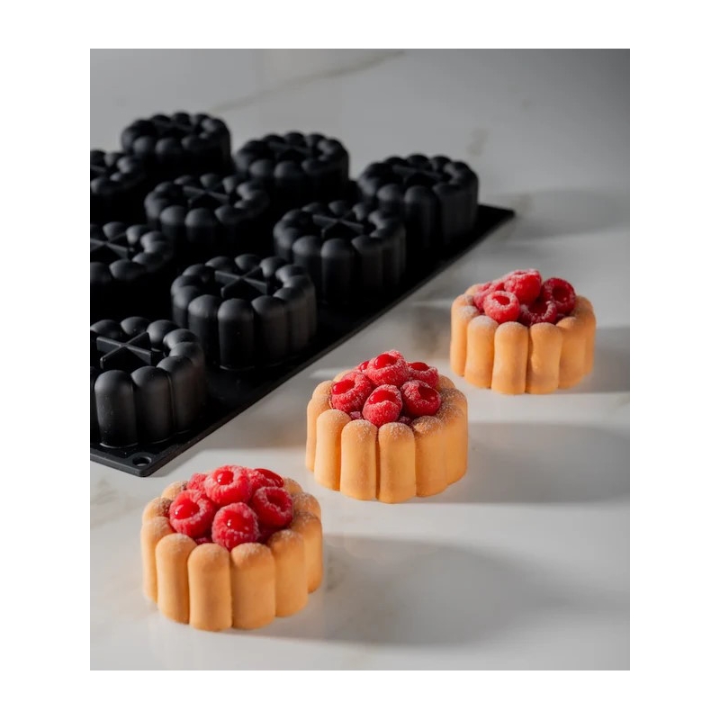 El molde Charme PX43129 de la línea Pavoflex de Pavoni Italia , diseñado por Emmanuele Forcone , traslada la elegancia de Charlotte a un formato individual , manteniendo el ritmo vertical y el equilibrio formal de la versión para pastel. Cada cavidad crea una porción individual compacta y refinada, con una superficie lateral marcada por elementos verticales regulares que la hacen inmediatamente reconocible. El resultado es una porción individual limpia, ordenada y moderna, ideal para exhibir y servir en plato.