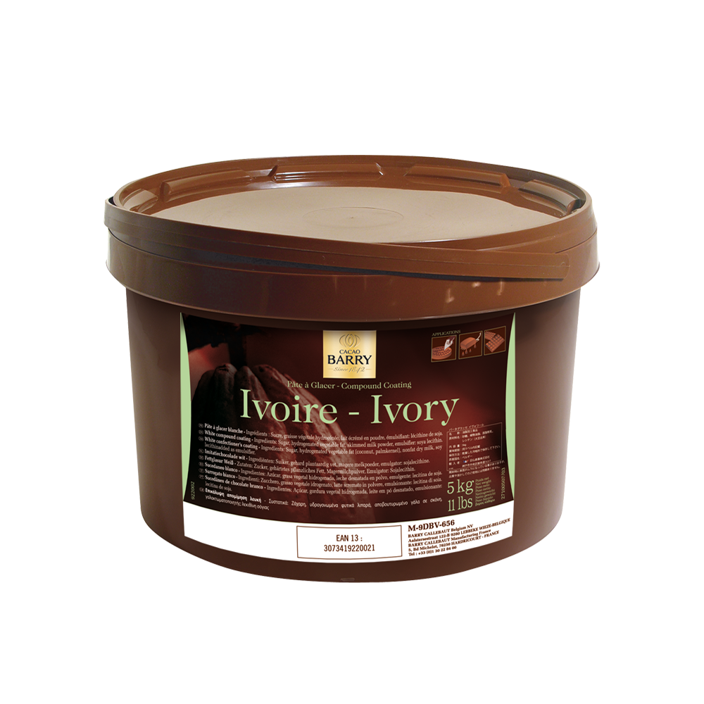 Cobertura especial de color marfil que no necesita atemperado y cuyo brillante perfecto es ideal para sus postres.
