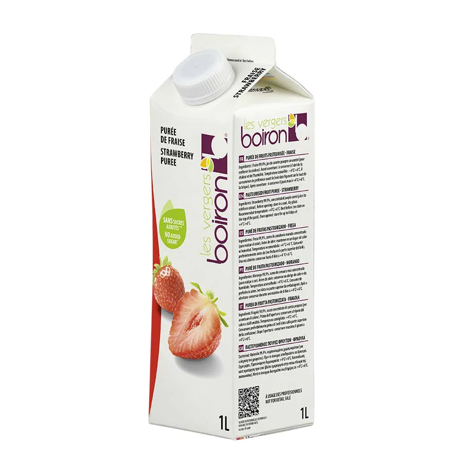 Este puré  de Fresa 100% de Boiron no contiene conservantes, aromas añadidos o colorantes artificiales y sin azúcares añadidos.