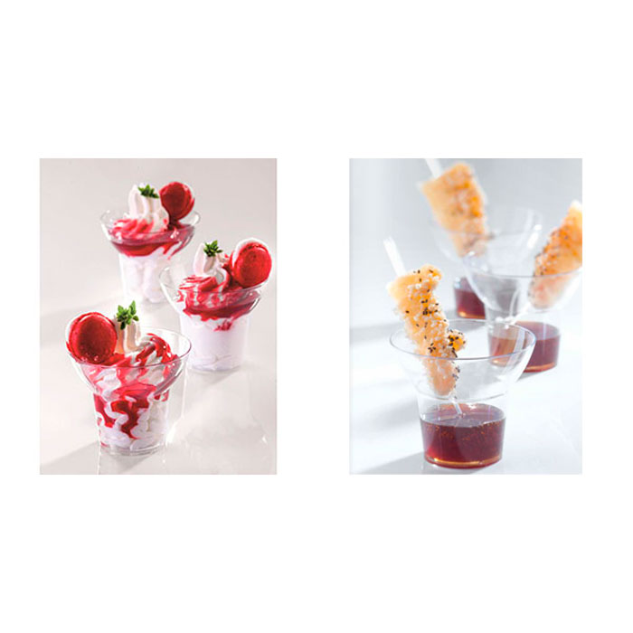 La compañía italiana ha elegido solo los materiales plásticos más finos preparados para el uso alimentario. Los vasos son transparentes para hacer parecer la comida todavía más apetecible y alentar a los Chefs a experimentar con nuevas recetas.